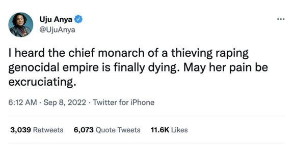 周四(9月8日——译注),卡内基梅隆大学教授、尼日利亚人乌居·安雅(Uju Anya)在推特上称:“我听说一个犯下强奸、盗窃、种族灭绝罪行的帝国的首席君主终于行将就木。愿她痛不欲生。”之后,她遭到猛烈抨击。这些话听来尖刻刺耳,对女王仇恨满腹,但对安雅及其家人那样,真正与家族世代痛楚抗争过的任何人来说,它们都不应令人惊讶;那些家族饱受英国掌控下的杀戮和流离失所之苦。