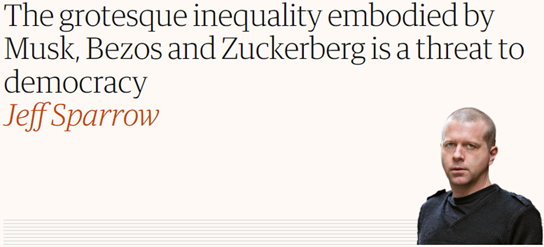 (作者生于1969年,是澳大利亚左翼作家、社会主义活动人士,任教于墨尔本大学。近著为2020年出版的Crimes Against Nature: Capitalism and Global Heating。本文原题“The grotesque inequality embodied by Musk, Bezos and Zuckerberg is a threat to democracy”,由《卫报》网站发布于2022年11月18日。听桥译,有不解之处,并对原文的段落有一定合并。)