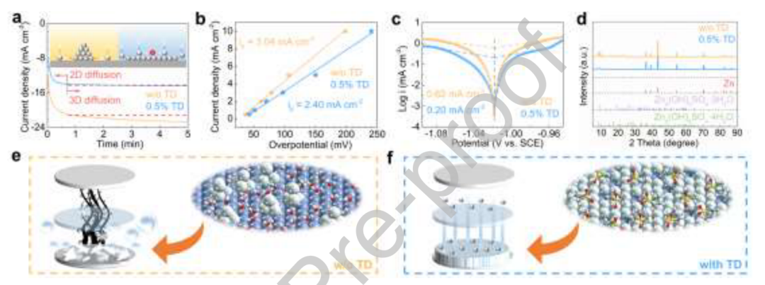 图5. a)计时电流图,b)交换电流密度,c)锌电极的Tafel图,d)锌电极在3 m ZnSO4和0.5% TD中经过25个循环后的XRD图。锌在ZnSO4电解质中的沉积过程示意图e)无和f)有TD界面稳定剂。