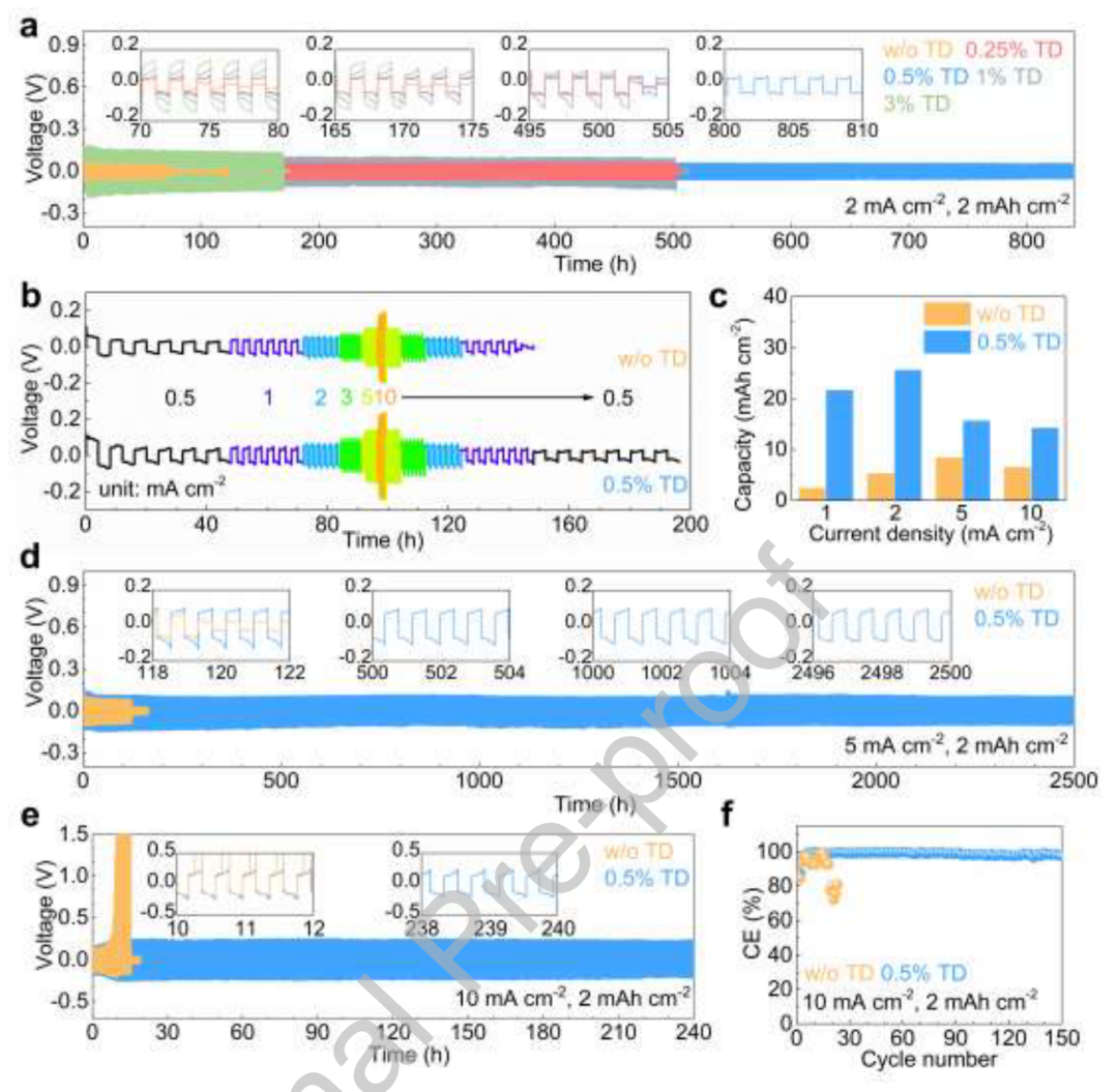 图1b比较了对称电池与纯ZnSO4和0.5% TD电解质在电流密度为0.5 mA cm-2 ~ 10 mA cm-2、容量为2 mAh cm-2时的电压曲线。0.5% TD电解质允许在不同电流密度下正常循环,而无TD电解质在电流恢复到1 mA cm-2时,由于不均匀锌沉积的积累而发生短路。在不同电流密度下进行连续沉积,结果汇总于图1c。在纯ZnSO4电解质中,在1 mA cm-2、2 mA cm-2、5 mA cm-2和10 mA cm-2下,沉积容量分别为2.5 mAh cm-2、5.4 mAh cm-2、8.5 mAh cm-2和6.6 mAh cm-2时发生短路。相比之下,在相应的电流密度下,在0.5%的TD下,获得了21.7 mAh cm-2、25.7 mAh cm-2、15.7 mAh cm-2和14.3 mAh cm-2的更高容量。