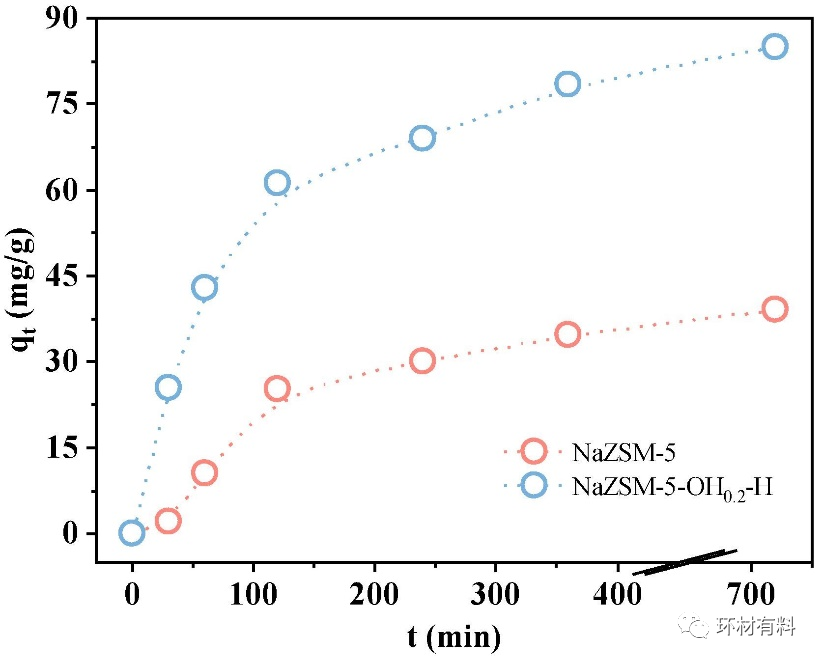 为了更深入地了解晶内中孔隙率如何促进分级沸石的催化性能,即结构-活性关系,我们获得了FAL在不同沸石上的吸附曲线(图4)。NaZSM-5-OH 0.2-H的 FAL吸附容量随时间显着增加,而母体NaZSM-5略有增加。FAL在NaZSM-5-OH 0.2-H上的平衡吸附容量大约是NaZSM-5的两倍,表明NaZSM-5-OH 0.2-H上有更多的位点可以容纳FAL。