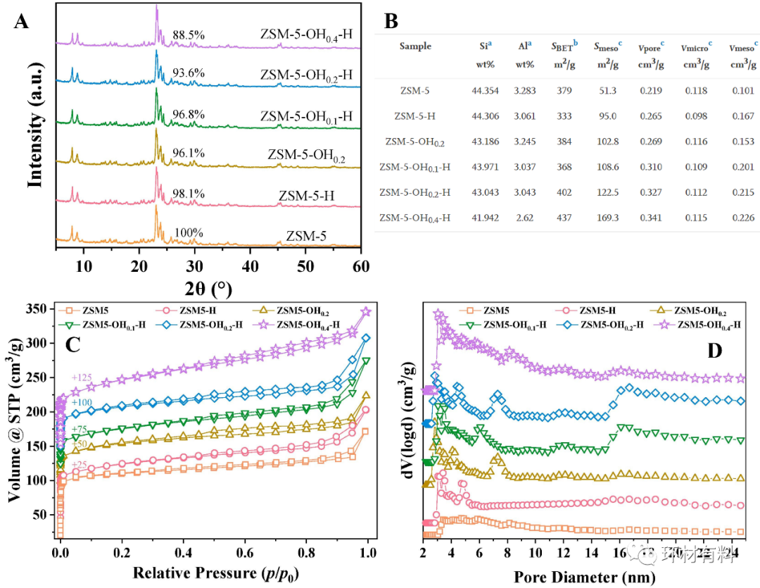 Fig.1 A.XRD patterns of parent zeolite and post-treatment zeolite. B. Elemental content and porosity of zeolites. C.N2 adsorption–desorption isotherms. D. the corresponding NLDFT pore size distribution curves