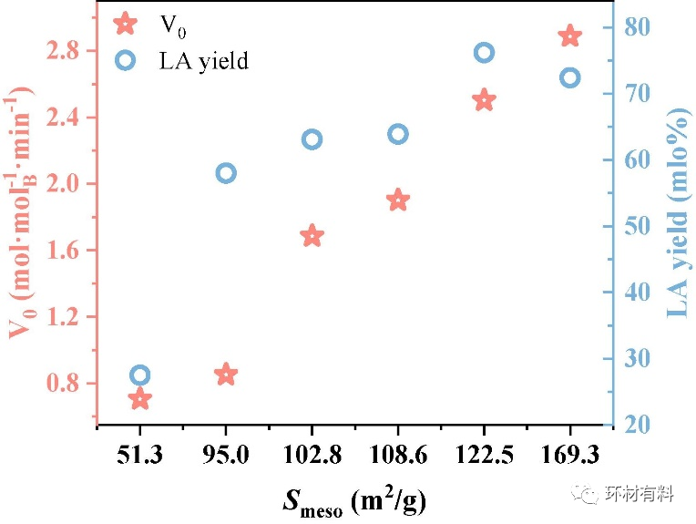 图2B显示了C B和S meso对测试沸石催化剂的 LA 选择性的影响。有明确的迹象表明,对于所有测试的沸石,LA选择性与C B和Smeso相关。随着C B的增加,LA选择性首先从46.4%迅速增加到76.6%,然后从76.6%略微下降到72.7% ,在研究的Smeso (51.3–169.3 m2/g) 中,LA选择性随着Smeso的增加先增加后减少 。