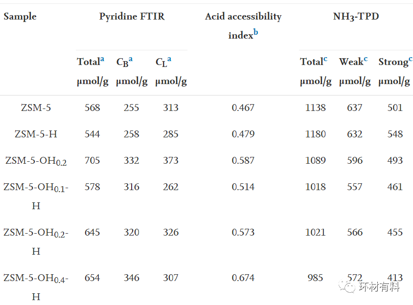 总酸量的结果列于表1中。与母体相比,酸处理样品ZSM-5-H表现出更强的酸性,这可能与由于沸石内部通道的畅通而更容易吸附氨有关。在ZSM-5-OH0.2的情况下,强酸性大部分得以保留,在随后的酸洗(ZSM-5-OH0.2-H)之后,总酸度从1089 μmol/g略微下降到1021 μmol/g,证实了酸洗过程中发生了Al原子的去除。