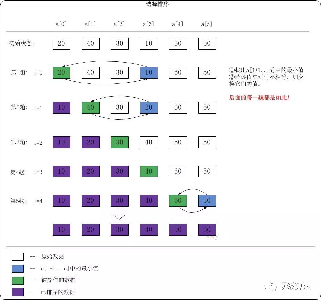 第1趟:i=0。找出a[1...5]中的最小值a[3]=10,然后将a[0]和a[3]互换。数列变化:20,40,30,10,60,50 -- > 10,40,30,20,60,50