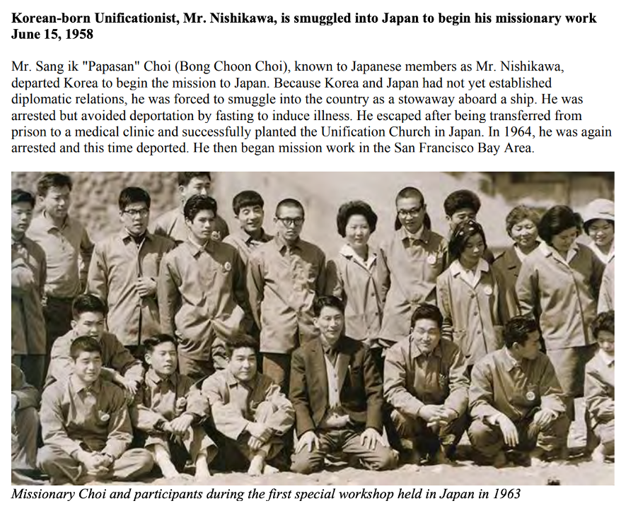 崔奉圣又名西川贤(音,Masaru Nishikawa),根据“统一教历史编纂委员会”(FFWPU History Compilation Committee)电子档案记载,崔于1958年6月(一说1958年7月)自釜山出发抵达东京,并于1959年10月举行了首次“统一教会”祈祷仪式。由于日韩两国其时并未建立外交关系,崔奉圣的日本之行并不顺利,不得不坐船偷渡入境,多次面临被警方逮捕的窘境。