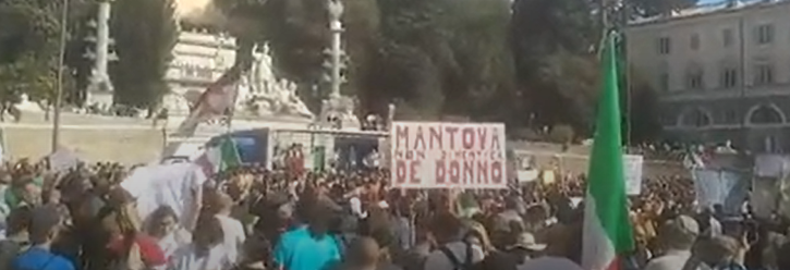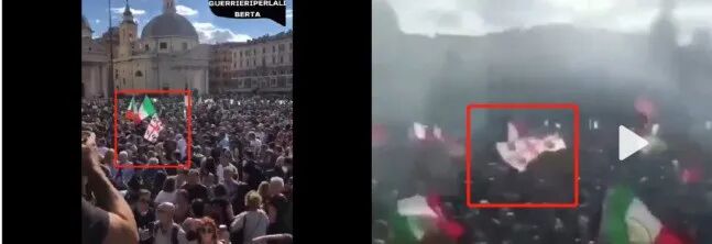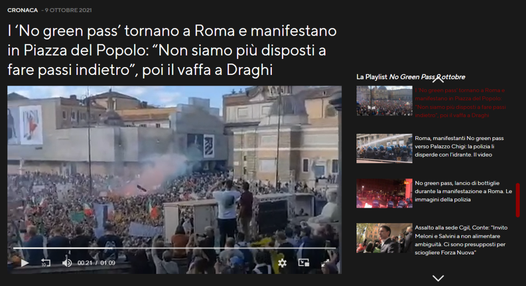 用意大利语与英语分别公开检索关键词“人民广场 抗议”(Piazza del Popolo protesta/protest),并将时间限定在2022年7月,未有相关结果。进一步搜索结果显示,去年10月9日,罗马人民广场曾发生针对即将于10月15日开始强制实施的“疫苗护照”的大规模抗议。不少意大利当地媒体都曾对此有过报道。例如,10月9日,意媒《每日事实》(Il Fatto Quotidiano)在一篇题为《“拒绝疫苗护照”重返罗马并在人民广场示威》的报道中插入一则长达1分09秒的视频,其中场景、天气与网传视频高度相似,都出现了达芬奇博物馆等建筑,以及烟雾、时装海报等元素。