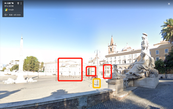 上述视频截图中出现的建筑为意大利首都罗马人民广场(Piazza del Popolo)附近的达芬奇博物馆(Museo Leonardo Da Vinci)。谷歌地图中收录了网友于2017年8月上传的罗马人民广场街景,周边建筑特征与视频中相符。经核查,上述视频拍摄者所处位置应为下图黄色方框所标记的电线杆附近。