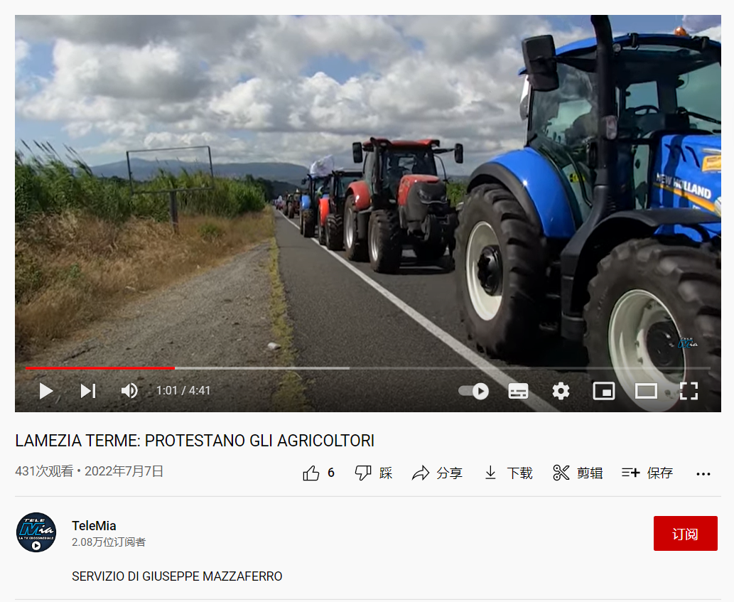 对比以上两则视频,可知网传片段并非所谓“意大利农民上街游行”,民众聚集实为抗议去年10月15日开始强制实施的“疫苗护照”管制措施。不过,近日来,意大利部分地区确实有农民通过游行表达对现任政府的不满情绪。意大利媒体TeleMia在YouTube频道上传的一则视频显示,7月7日,意大利拉美齐亚泰尔梅(Lamezia Terme)的农民在田间游行,抗议“农耕材料价格上涨”,但此次游行规模有限,仅有数十人参加。