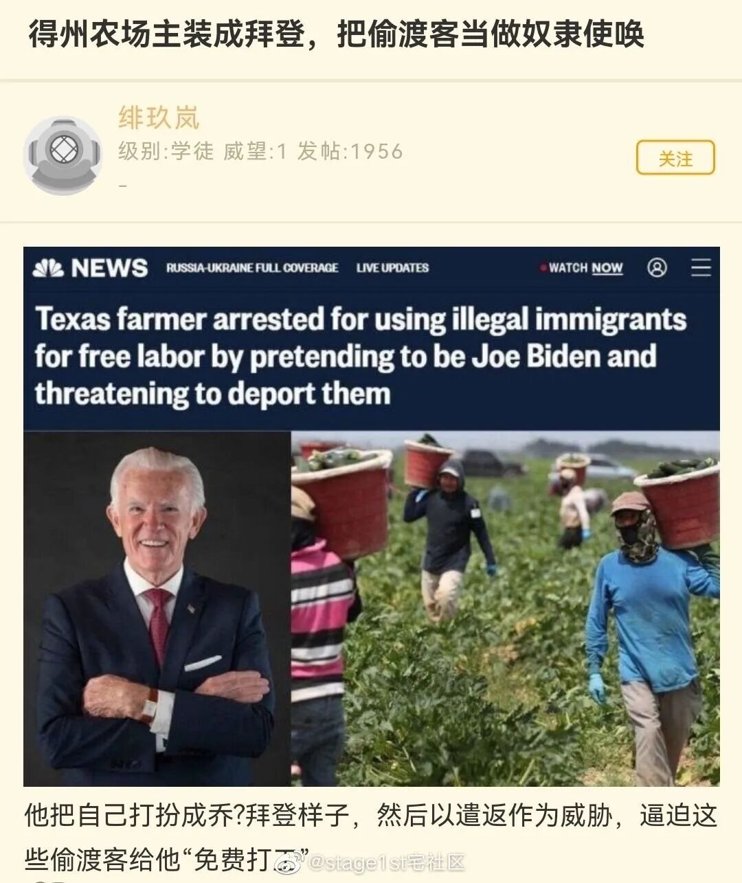 7月22日,社媒平台上流传帖子称,美国得克萨斯州农场主冒充美国总统拜登,以遣返作为威胁,把偷渡客当做奴隶使唤,逼迫非法移民为其免费打工。