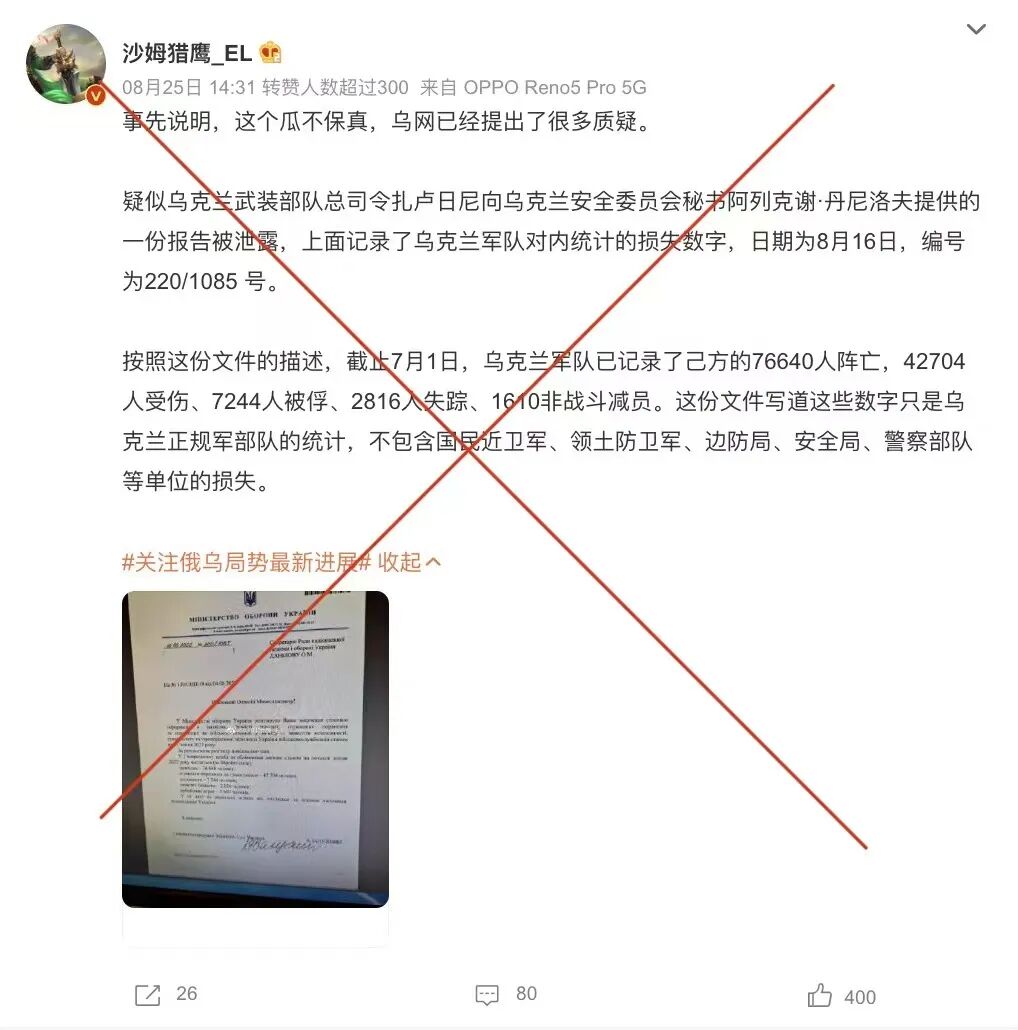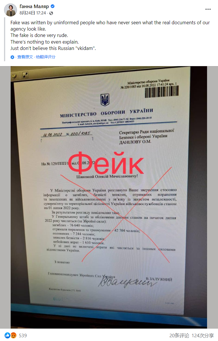 对网传机密报告照片在谷歌搜索引擎中进行反搜,可以发现此份文件已为官方辟谣。8月24日,乌克兰国防部副部长安娜·马尔亚尔(Anna Maliar)在脸书上写道:“这份虚假文件是那些不知道我们国防部真正的文件长成什么样的不明真相的人写的。”她在文件上画了一个巨大的红叉,用红色字体写着“假”。