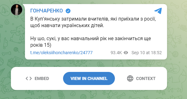贡恰连科用个人telegram账号发文称,从俄罗斯前往乌克兰教授儿童的教师在库比扬斯克市被拘留。