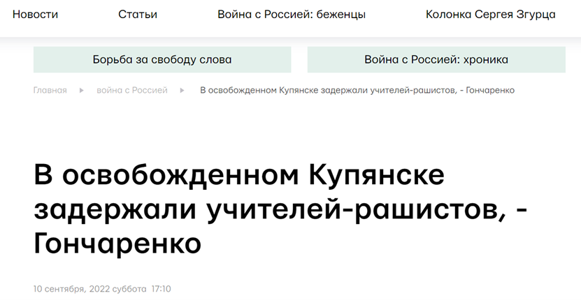 Strana报道中没有提到“被拘留教师”的具体情况。进一步溯源发现,韦列修克其实并非这一消息的最初信源。早在9月10日,乌克兰网络电视台Espreso.tv等媒体曾援引乌克兰国会(拉达)议员阿列克谢·贡恰连科(Oleksiy Goncharenko)的消息称,从俄罗斯前往乌克兰教授儿童的教师在库比扬斯克市被拘留。而库比扬斯克正是哈尔科夫境内的一座城市,其大部分领土已重新被乌克兰军队夺回。