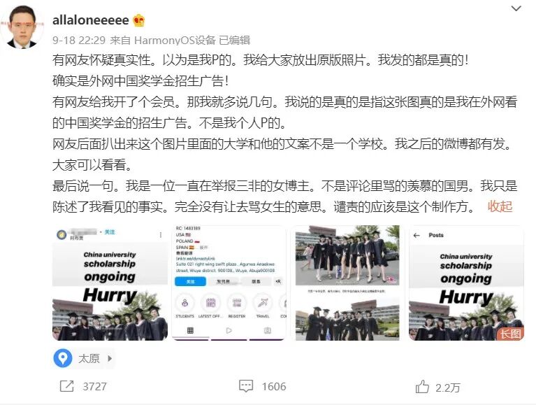 第一张图内容为8位身着学位服的女生合照,上方的文字显示“中国高校奖学金招生中,快来”。第二张则解释了上图转自一位名为“allaloneeeee”的用户,“allaloneeeee”的配文中说:“有网友怀疑真实性。以为是我p的。我给大家放出原版图片。我发的都是真的!确实是外网中国奖学金招生广告。”