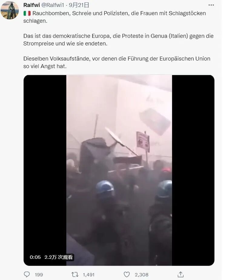 在推特也有大量用户对这条视频进行转发传播,称“这就是在民主的欧洲,在热那亚发生的电价抗议活动,看它是如何收尾的”。