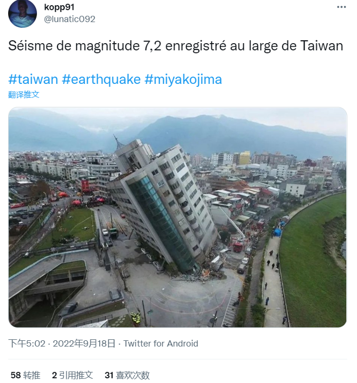 在谷歌中对网传图片进行反向搜索,可以发现原图早在2018年就已经出现。图中建筑为位于花莲县商校街2号的云门翠堤大楼。2018年2月6日晚11点50分左右,花莲县近海发生6.4级地震,震源深度6.3千米,共造成17人死亡,200人受伤。在罹难的17人中,有14人被压在严重倾斜的云门翠堤大楼之下。