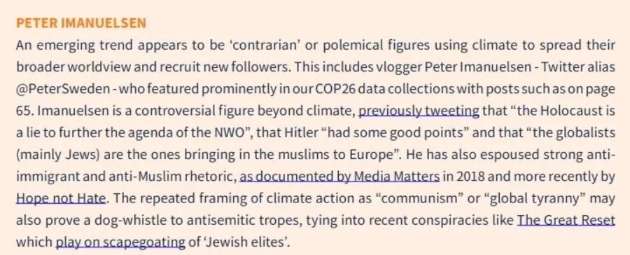 在英国智库机构“战略对话研究所(Institute for Strategic Dialogue, ISD)”与“CASM技术(CASM Technology)”以及“气候行动反对虚假信息联盟(Climate Action Against Disinformation alliance, CAAD)”联合制作的报告《否认、欺骗、延迟:在 COP26 及以后记录和应对气候虚假信息》中,PeterSweden被认为是具有“阴谋论”的希特勒支持者,并且多次散布关于气候行动的虚假信息。