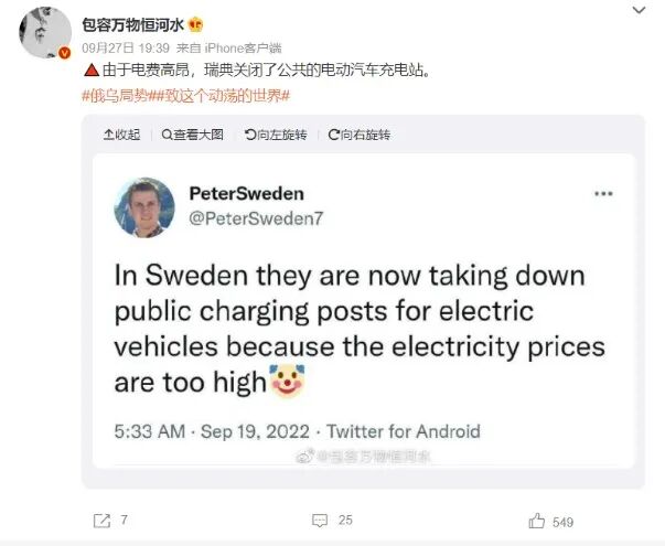有微博网友引用推特平台言论,称“由于电费高昂,瑞典关闭了公共的电动汽车充电站”。其配图中的推特原文称:“在瑞典,他们现在正在拆除电动汽车的公共充电站,因为电价太高了。”发布者并没有说明消息来源。