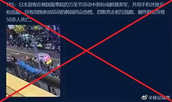 社交平台上有传言称:“日本游客在韩国梨泰院的万圣节活动中装扮成醉酒美军,并用手机外放开枪音频。导致周围参加活动的韩国民众恐慌,四散奔走相互践踏。最终疑似导致50多人死亡。”