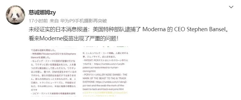 微博网友评论:“看来莫德纳疫苗出现了严重的问题。”其截图显示,该消息来自日本网站Abema。
