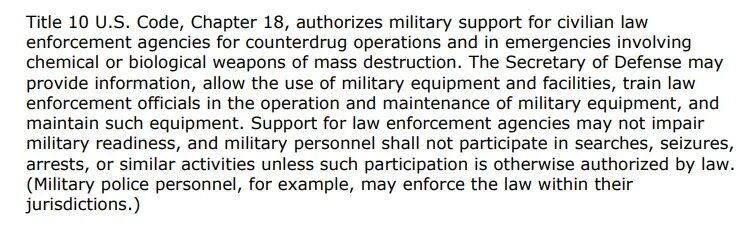 另一方面,Real Raw News的这篇报道存在明显错误,文中多次强调美国特种部队和海军陆战队合作实施了抓捕,但是根据美国法典第10篇第18章,“军事人员不得参与搜查、扣押、逮捕或类似活动,除非法律另有授权。”虽然法典规定存在特殊情况(核材料、叛乱等),但该报道所述显然不属于特殊范畴。美国《地方保安队法》(Posse Comitatus Act)也限制美国军队插手本土治安,起初禁止“故意使用陆军或空军的任何部分来执行法律,除非宪法或国会法案明确授权”,2021年,这一法条涵盖范围被扩大到了美国海军、海军陆战队和太空部队。