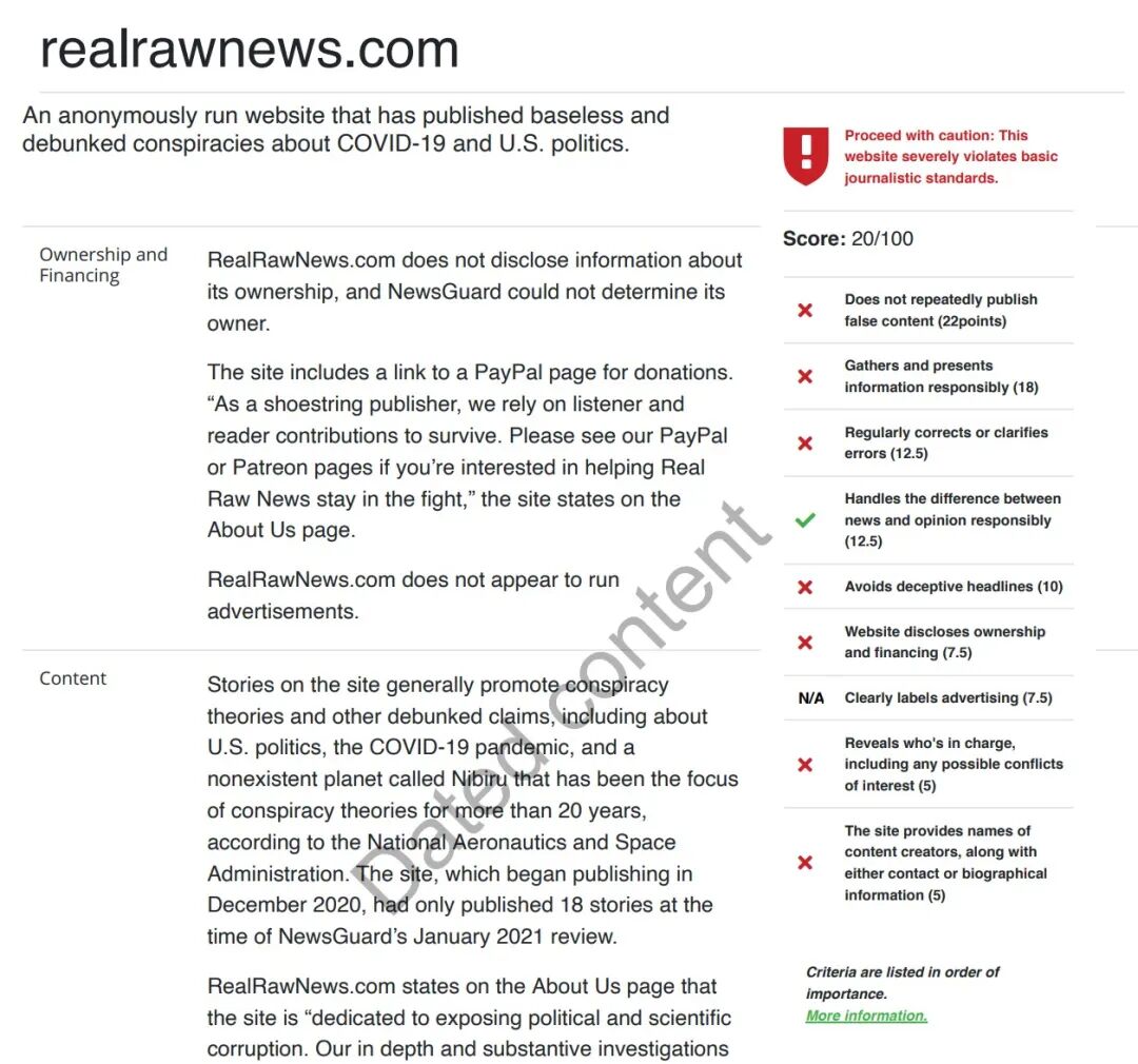 Real Raw News网站包含大量虚假信息。“澎湃明查”今年4月份就曾发布一篇关于该网站造谣的文章《明查|福奇被特殊武装部队逮捕?》,引用了事实核查机构Politifact在2021年9月对Real Raw News的调查报告,指出该网站创始人Michael Baxter在成立Real raw news之前至少还运营了三个其他网站和相关YouTube频道,这些网站和频道都涉嫌宣传政府机关和外星人的阴谋论。