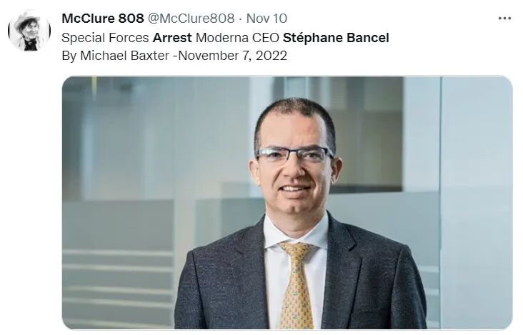 中外社交网络流传一则消息:“美国特种部队逮捕了新冠疫苗生产商莫德纳(Moderna)的CEO Stéphane Bancel”。推特网友称,该说法的报道者为Michael Baxter。