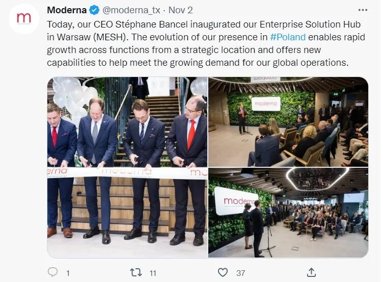 莫德纳公司的推特账号称,Stéphane Bancel 11月2日出席了位于华沙的一项揭幕仪式