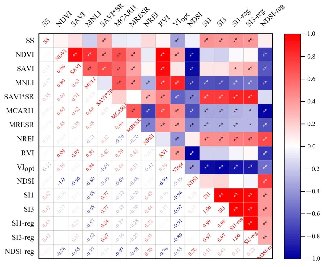 图5 无人机多光谱指数与土壤盐分相关性分析