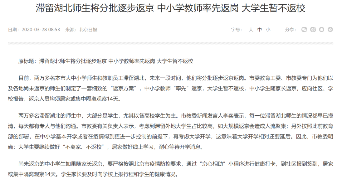 看看北京老大哥的态度:对于2万多名滞留湖北的大中小学师生和教职员工,政策是逐步返京返岗。中小学教师率先返岗,大学生暂不返校。