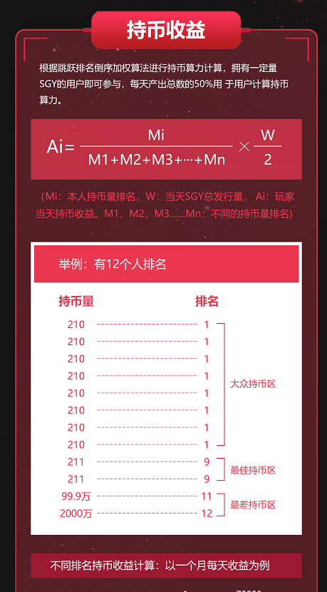 持币收益方面,根据跳跃排名倒序加权算法进行持币算力计算,拥有SGY的每个用户即可参与,每天产出总数的50%用于用户计算持币算力。