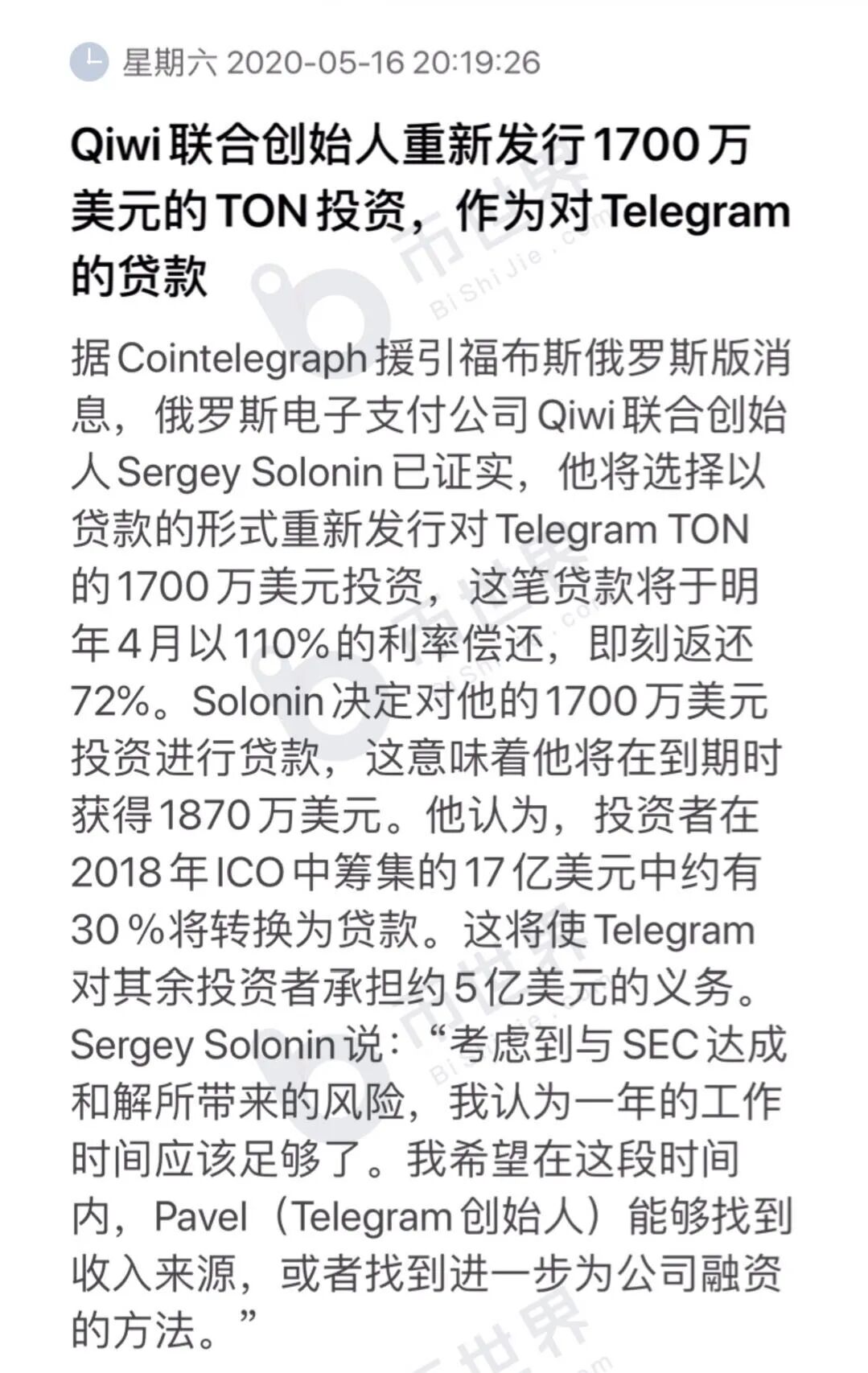 随后一周,Qiwi联合创始人重新发行1700万美元的TON的投资,作为对Telegram的贷款。