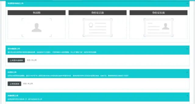 考生需要上传个人免冠照、身份证正反面照片、成绩表、自述信等文件,注意每次上传之后都要及时保存。