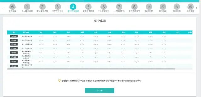 依次点击“编辑”按钮,录入高中阶段各项成绩,包括高一至高二共四个学期的期末成绩、高三至少两次校级以上模拟考试成绩以及学业水平考试成绩。