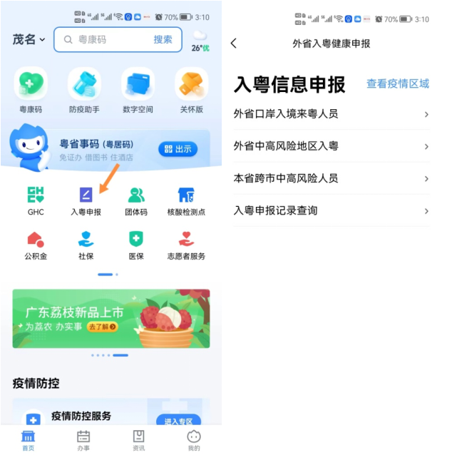 “粤省事”小程序→“入粤申报”