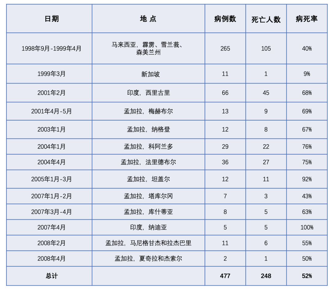1998~2008年亚太区域尼帕病毒和尼帕样病毒感染的发病率和死亡率