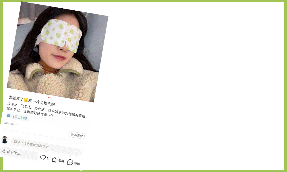 上班族平时在午休的时候也可以敷上一片,不仅能舒缓眼部疲劳,还能让你睡得更香哦!