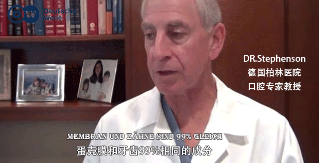 DR.Nader Salib 美国口腔协会医学博士介绍,蛋壳膜与牙齿成分匹配,无缝连接,6小时长出2.5微米晶体修复处,其成分、微观结构和力学性能和天然牙齿一模一样。