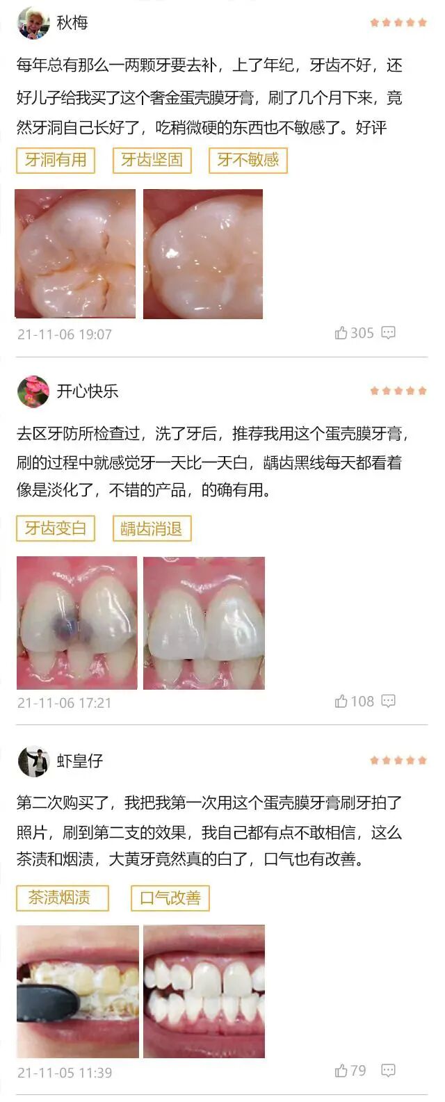 同事刘姐拿回家用了3只Amave蛋壳膜牙膏后,扒开牙齿一看,牙洞没了,牙菌斑掉了好多,牙齿也白了几度,宛若换了一嘴新牙~
