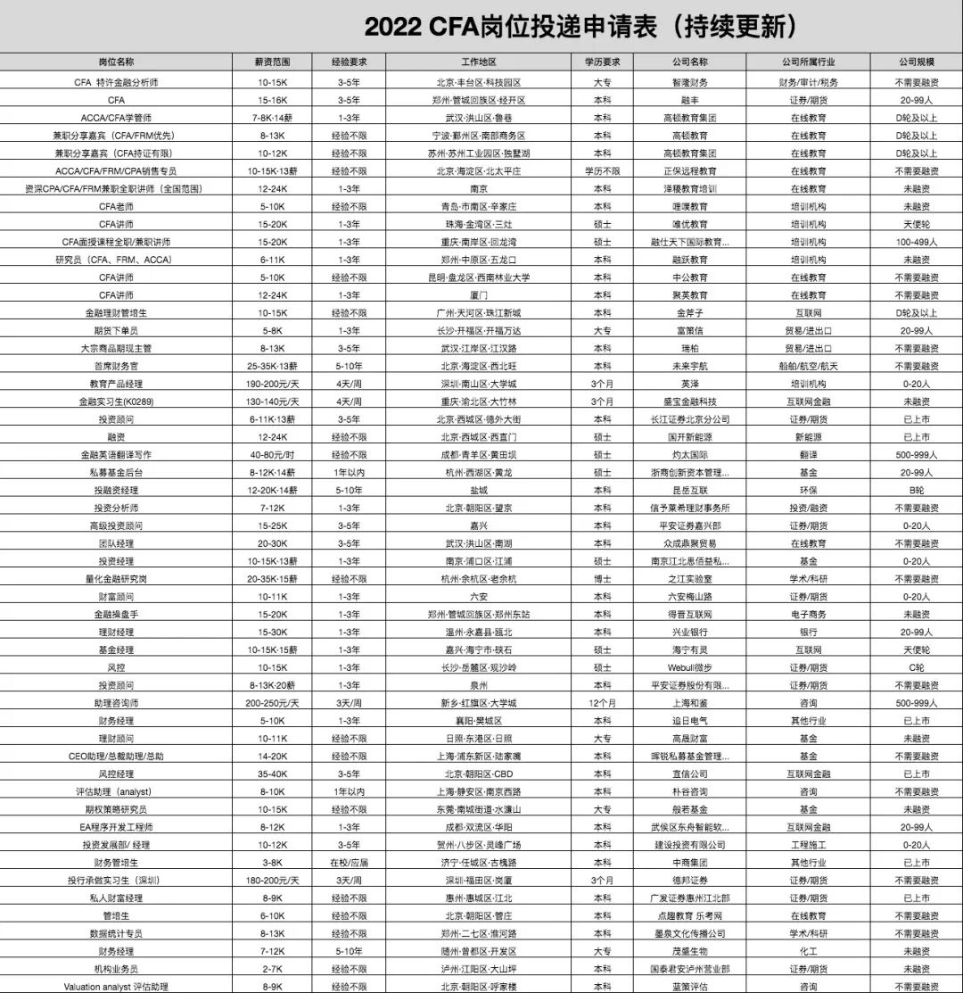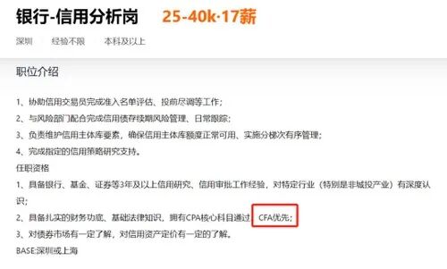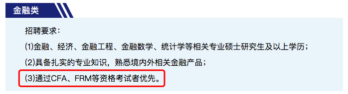 在国外,J.P. Morgan(摩根大通)、Morgan Stanley(摩根士丹利)、Goldman Sachs(高盛)、、Citigroup(花旗集团)、BlackRock(贝莱德)、HSBC(汇丰银行)、UBS(瑞银)等都是CFA持证人主要的雇主,每家都有逾千名CFA持证人供职。在国内,以“三中一华”为代表的券商,它们的招聘条件里少不了一条——持有CFA证书者优先。而且头部银行的高薪招聘也要求CFA优先。![]()