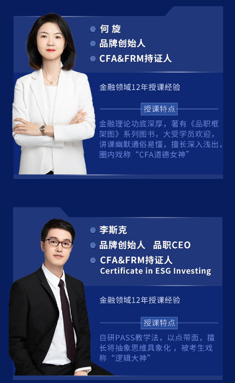 CFA金牌讲师李斯克,道德女神何旋,两位老师都拥有12年金融授课经验,帮助7000+考生顺利通过考试。在金融培训行业耕耘十余年,他们总结出来的考试经验,以及对考点的把握,已经是老师傅级别了!![]()