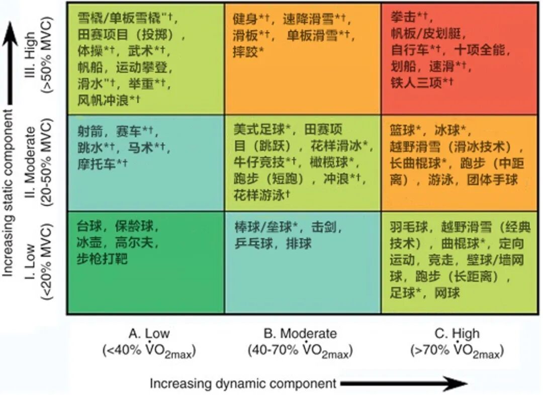 我们按照运动强度对各项运动进行排列,下图中越靠近右上角的项目运动强度越高,左下角则较低。