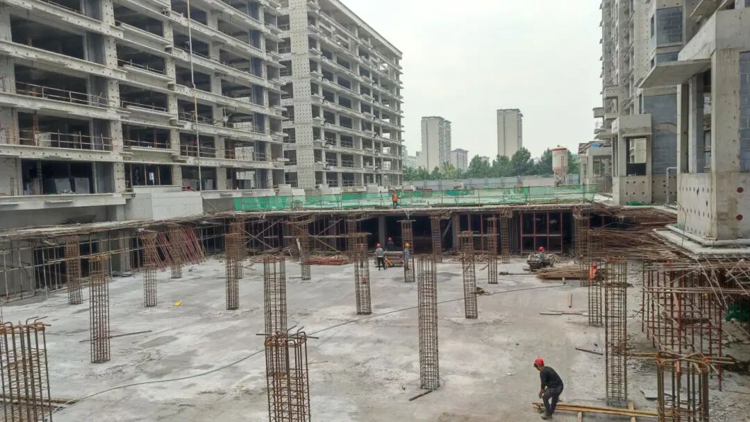 施工现场机械轰鸣,辛勤的建设者们正在挥汗如雨赶工期。目前项目首批交付楼栋已经全部封顶,项目南区楼栋也在按计划紧锣密鼓的施工。