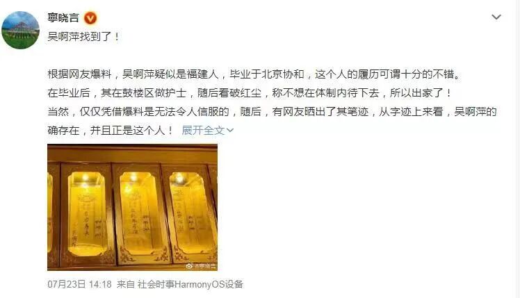 有网友爆料称,吴啊萍是其同事的前同事,名字与笔迹都吻合,曾在南京某医院当护士,后辞职出家。