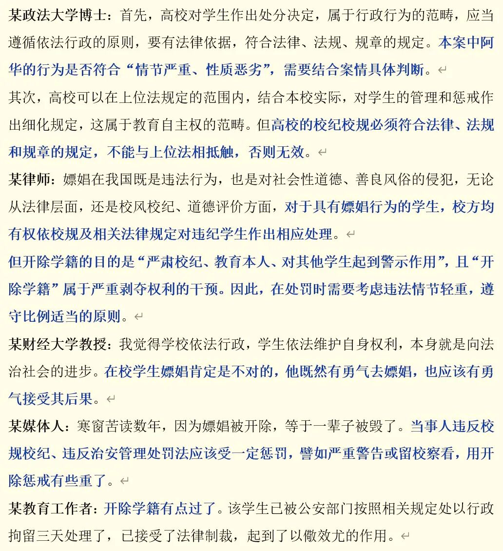 7月4日,阿华向学校提交了《异议书》。他认为,嫖娼只是一般的违法行为,并非涉嫌犯罪,开除的处分过重且无上位法支持。