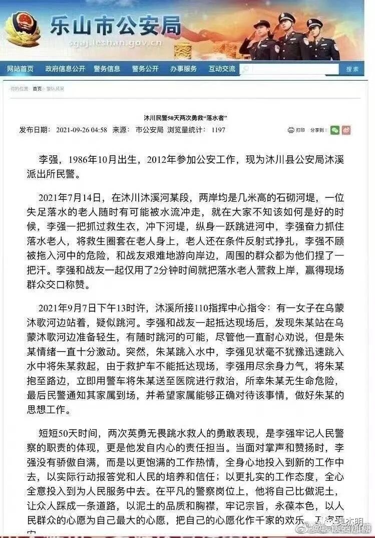 据澎湃新闻报道,沐川县公安局在2021年9月曾刊载一篇关于李某的文章《沐川民警50天两次勇救“落水者”》,文章提及李某1986年10月出生,2012年参加公安工作,现为沐川县公安局沐溪分局派出所民警。