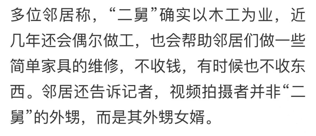 二舅的邻居也加入到反水的行列中,拍摄者并非二舅的外甥,而是外甥女婿,显然作者在这里虚构了一个身份。