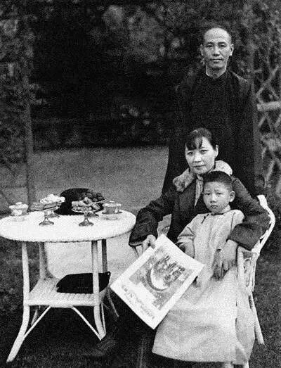 宋美龄手执介绍蒋介石的伦敦新闻画报偕同外甥孔令杰与蒋中正合影于庭院。宋美龄时年29岁。