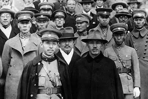 1930年11月15日,中原大战结束后,张学良应蒋介石之邀访问南京,此为蔣、张两人赴紫金山拜谒中山陵时的合影。1931年9月22日,九一八事变后,南京市国民党员举行抗日救国大会,蒋发表演说,声称“国存与存,国亡与亡”,蒋介石时年44岁。