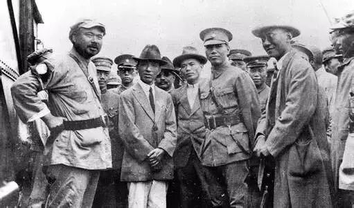 1930年,中原大战三位主角,右起冯玉祥、蒋介石、阎锡山。1929年,头山满(左一)与犬养毅(右二,曾任日本第二十九任首相,孙中山密友)拜访蒋介石(右一),左二为戴季陶。